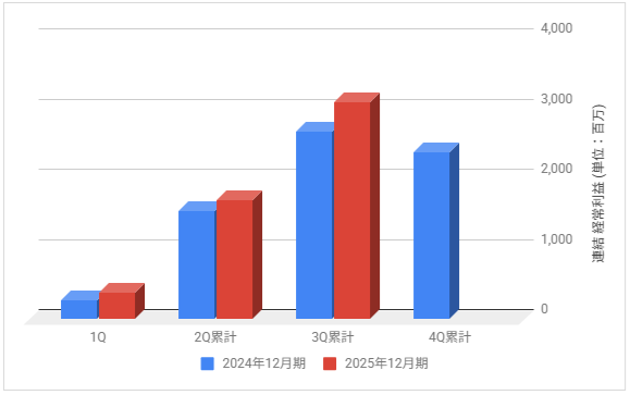 下記は3か月決算の経常利益の推移と前期との比較です。