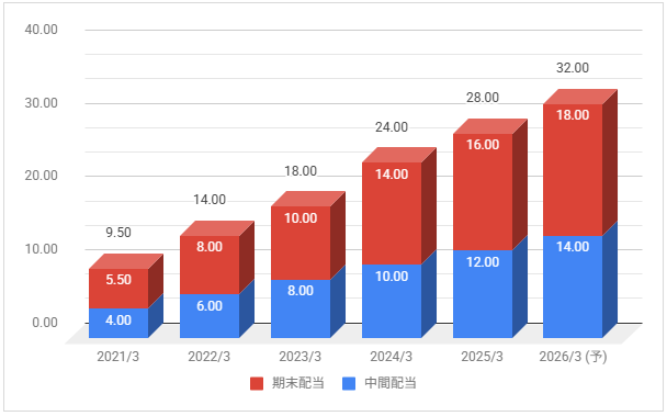 配当金は増配推移しています。2026年3月期は増配予定としています。