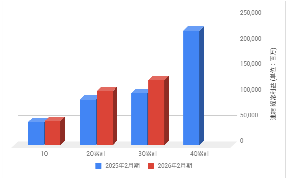 下記は2026年2月期の各決算期における連結経常利益の推移と前期との比較です。