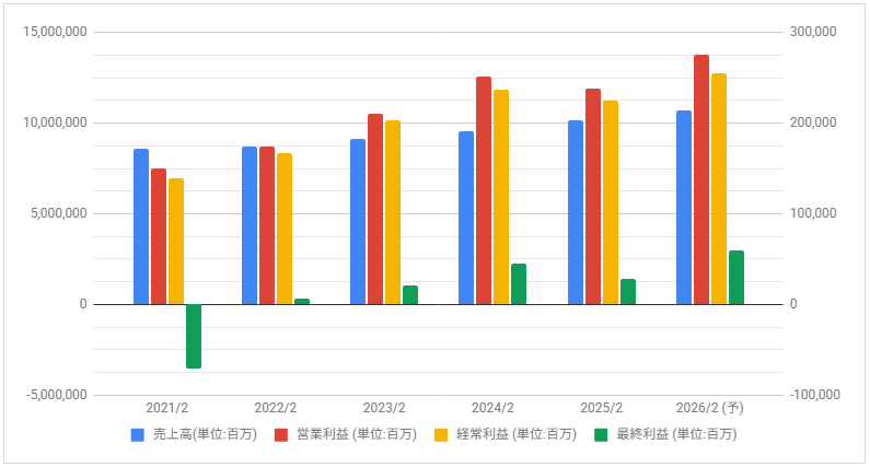 2021年2月期は最終赤字となりましたが、その後は黒字回復して増益で推移。