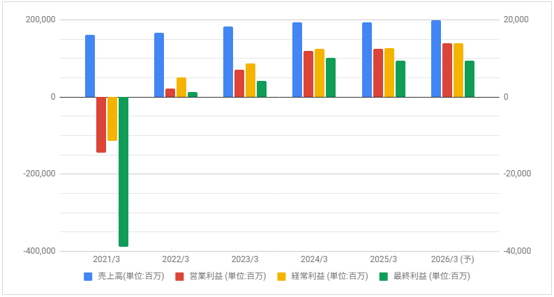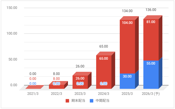 業績悪化で2021年3月期は無配当となりました。2022年3月期に復配し、その後は増配。2025年3月期は大きく増配、2026年3月期も増配予定としています。