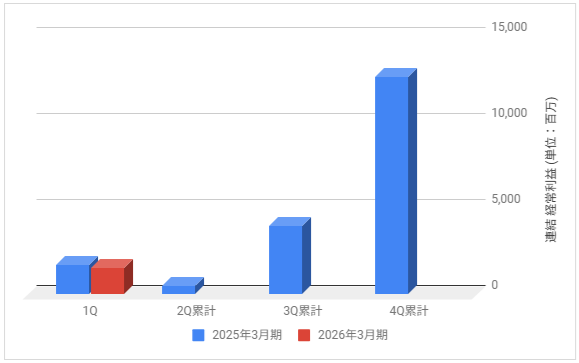 下記は2026年3月期の各決算期の連結経常利益の推移と前期との比較です。