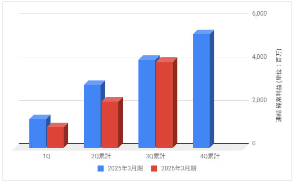 下記は2026年3月期の各決算期における連結経常利益の推移と前期との比較です。
