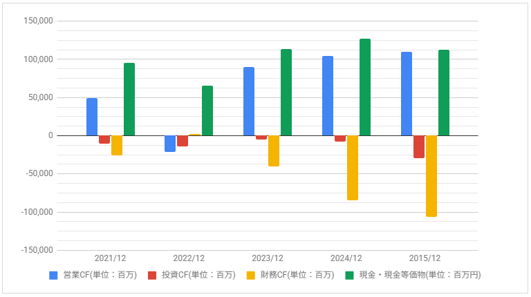 2022年12月期の営業CFはマイナスですが、2023年12月期以降は大きくプラスです。