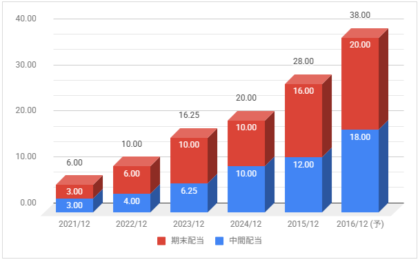 下記は配当金の推移です。配当権利月は6月(中間配当)と12月(期末配当)です。