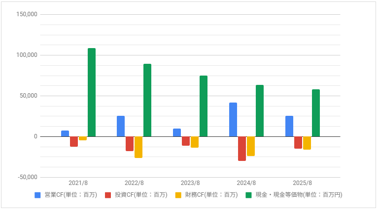 営業CFは2021年8月期、2023年8月期は大きく減りましたが、2024年8月期は大きく増えています。
