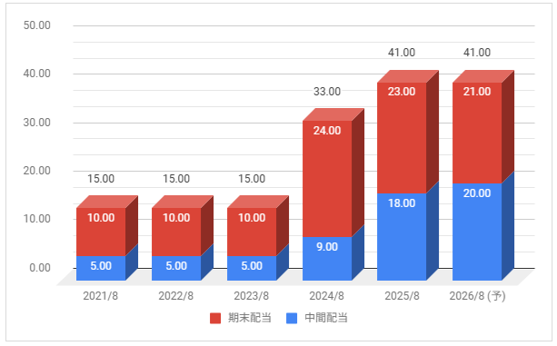 配当金は2024年8月期に大きく増配、2026年8月期は据え置き予定としています。
