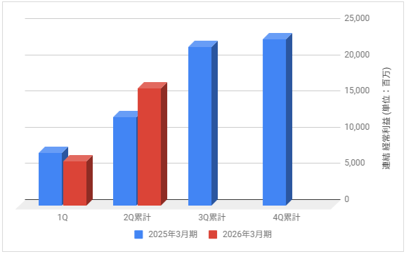下記は2026年3月期の各決算期における連結経常利益の推移と前期との比較です。