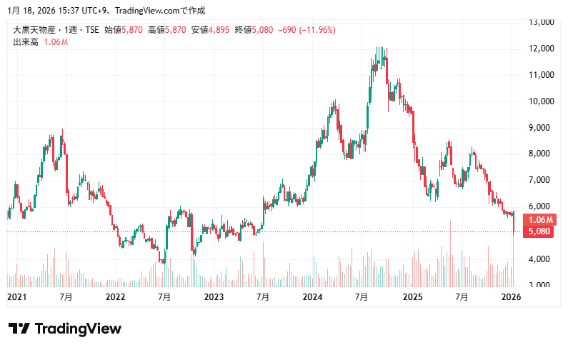 下記は大黒天物産5年分の週足株価チャートの推移です。
