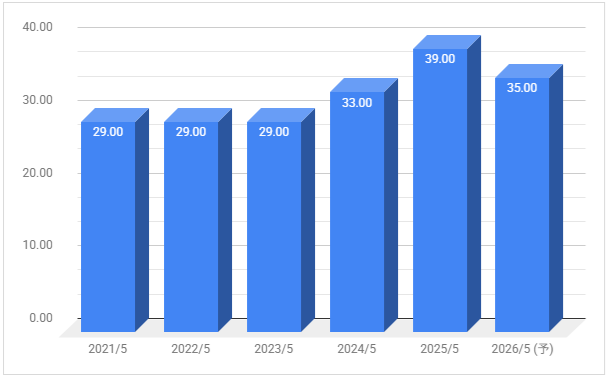 2025年5月期は特別配当が4円、2026年5月期は特別配当を抜いて据え置き予定としています。
