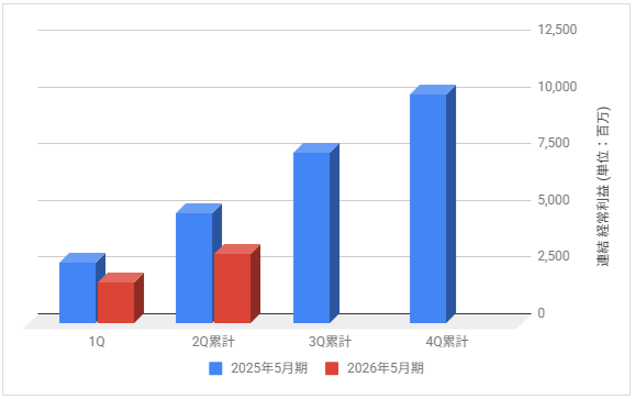 下記は2026年5月期の各決算期における連結経常利益の推移と前期との比較です。
