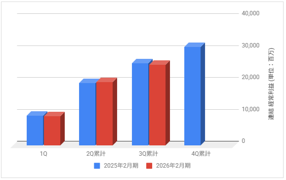 下記は2026年2月期のDCMホールディングスの各決算期における連結経常利益の推移と前期との比較です。