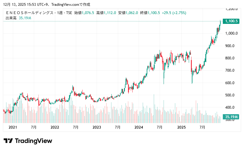石油元売り最大手のENEOSホールディングス(5020)、配当は安定した推移で高い利回りです。株価指標と業績推移、株価チャートと配当推移を確認していきます。