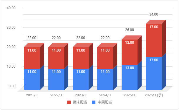 配当は据え置きで推移していましたが、2026年3月期は増配予定です。