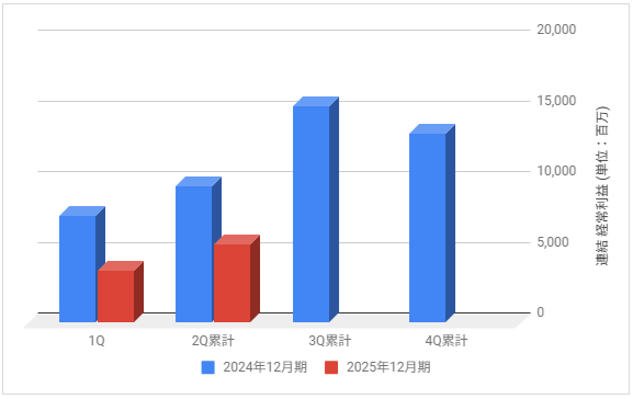 下記は2025年12月期の各決算期における連結経常利益の推移と前期との比較です。