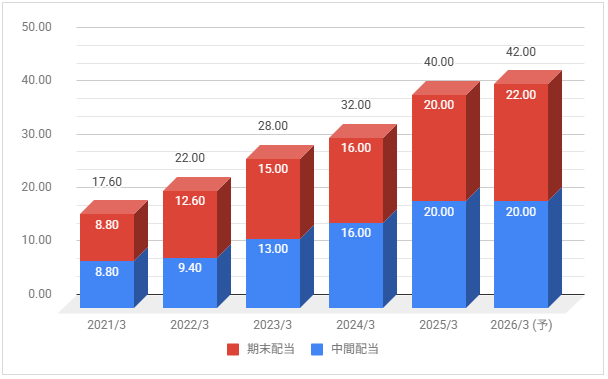 配当金は毎年増配しています。2026年3月期も増配予定としています。