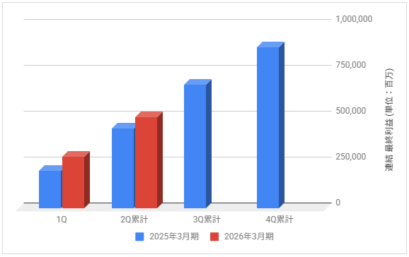下記は2026年3月期の各決算期における連結最終利益の推移と前期との比較です。