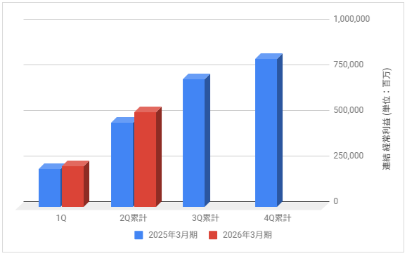 下記は2026年3月期の各決算期における連結経常利益の推移と前期との比較です。