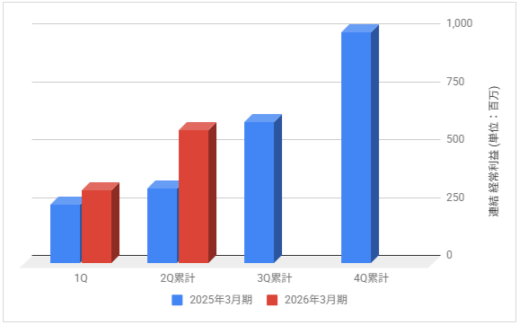 下記は2026年3月期の各決算期における連結経常利益の推移と前期との比較です。