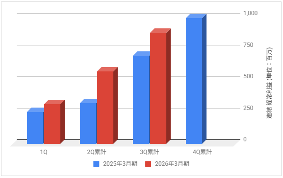 下記は2026年3月期の各決算期における連結経常利益の推移と前期との比較です。