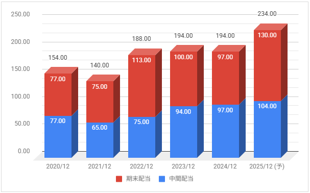 配当は2021年12月期に減配、2022年12月期に大きく増配。2025年12月期は増配予定としています。