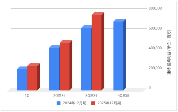 下記は2025年12月期の各決算期における連結営業利益の推移と前期との比較です。
