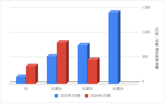 下記は2026年3月期の各決算期における連結経常利益の推移と前期との比較です。