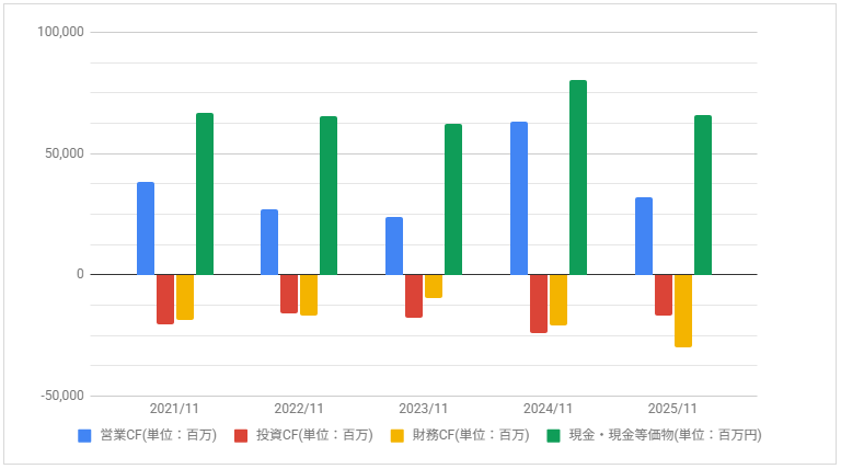 営業CFは減少していましたが、2024年11月期は増えています。