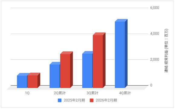 下記は2026年2月期の各決算期における連結経常利益の推移と前期との比較です。