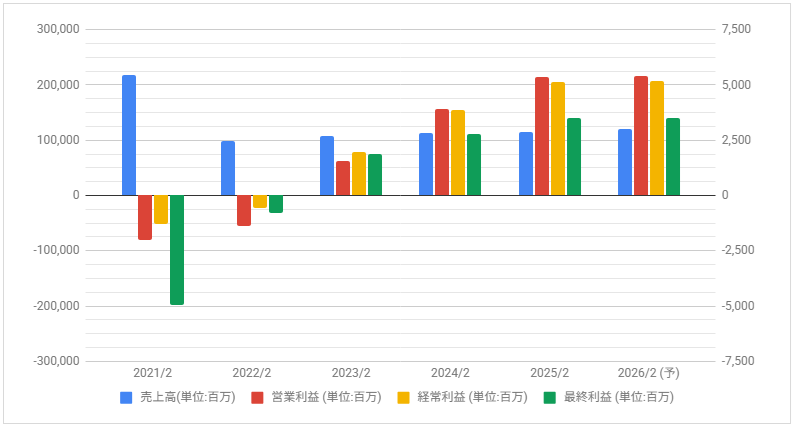 業績悪化により2021年2月期、2022年2月期は無配当に。2023年2月期は復配、2025年2月期は増配しています。