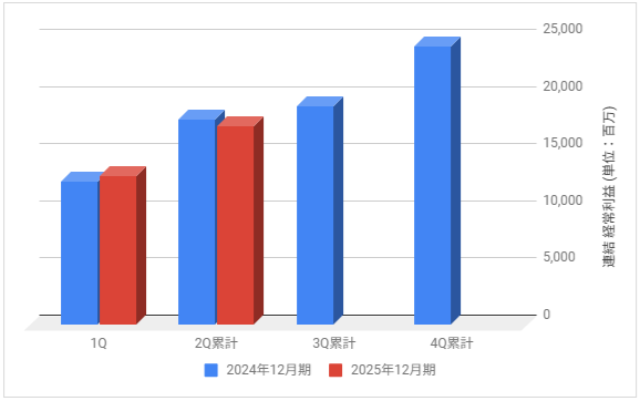 下記は2025年12月期の各決算期における連結経常利益の推移と前期との比較です。