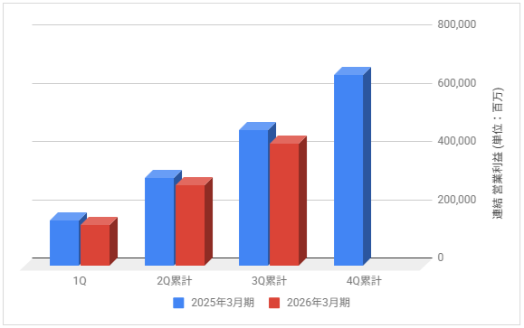 下記は2026年3月期の各決算期における連結営業利益の推移と前期との比較です。