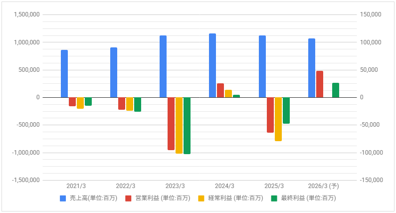 2023年3月期は大きく赤字で着地、2024年3月期は黒字回復しましたが厳しく、2025年3月期は赤字に。