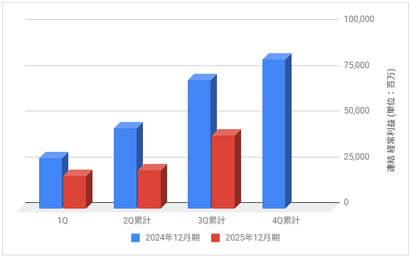 下記は2025年12月期の各決算期における連結経常利益の推移と前期との比較です。