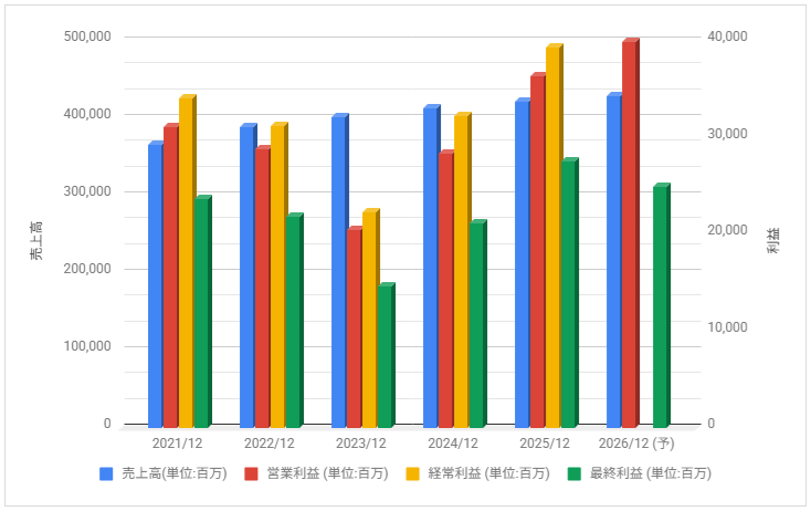 2021年12月期以降は厳しめで連続減益推移でしたが、2024年12月期、2025年12月期は増益に。