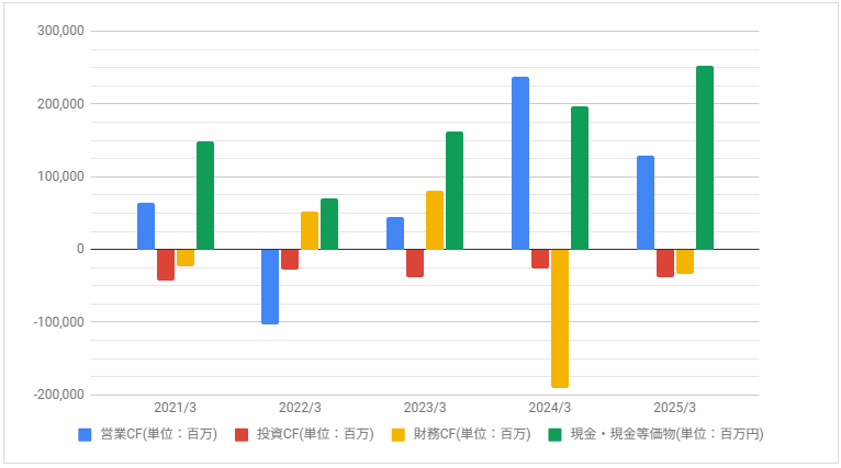 2022年3月期の営業CFは大きくマイナスですが、2024年3月期の営業CFは大きくプラスです。