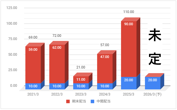 配当金は大きく上下しています。2026年3月期の中間配当は20円、年間配当は未定としています。