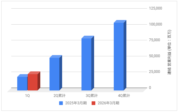 下記は2026年3月期の各決算期における連結営業利益の推移と前期との比較です。