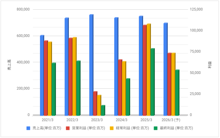 配当は業績に連動しており、2026年3月期の年間配当が仮に70円とした場合の利回りは約1.4%です。