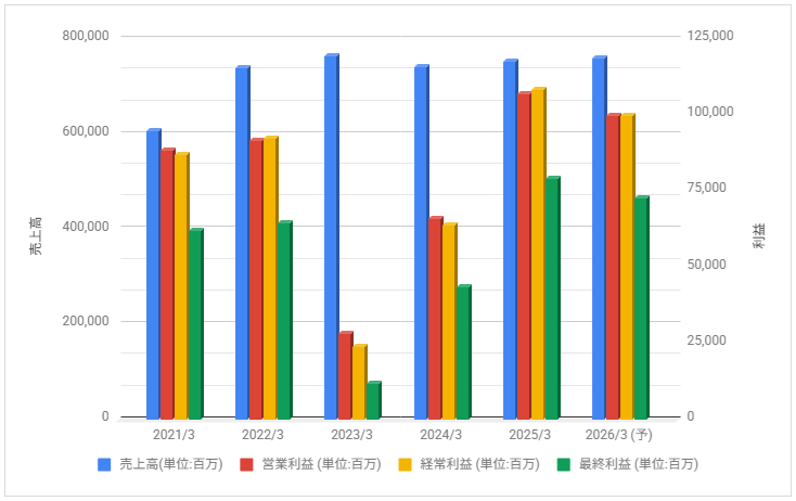 下記は売上高・営業利益・経常利益・最終利益の推移です。