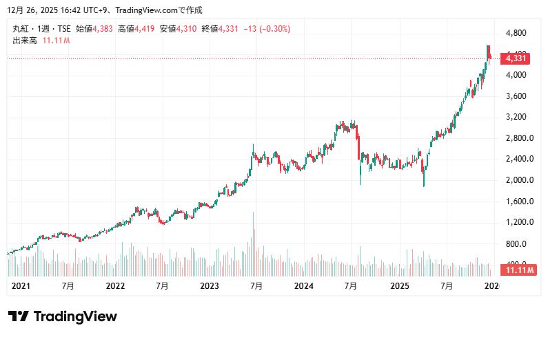 株価は商社銘柄への注目・業績回復もあり大きく上昇、2024年7月は他の銘柄同様に下落して緩やかにすいいしていましたが、2025年7月以降は大きく上昇しています。