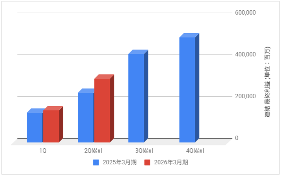 下記は2026年3月期の各決算期における連結最終利益の推移と前期との比較です。