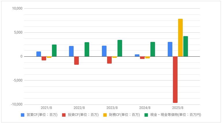 2025年8月期の投資CFが大きく増えています。