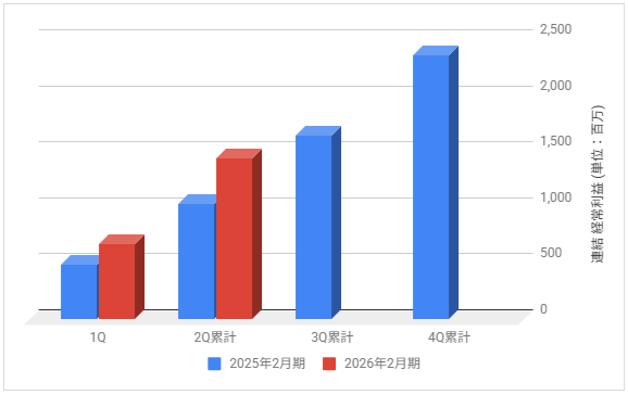 下記は2026年2月期の各決算期における連結経常利益の推移と前期との比較です。