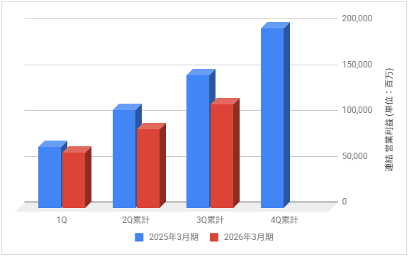 下記は2026年3月期の各決算期における連結営業利益の推移と前期との比較です。