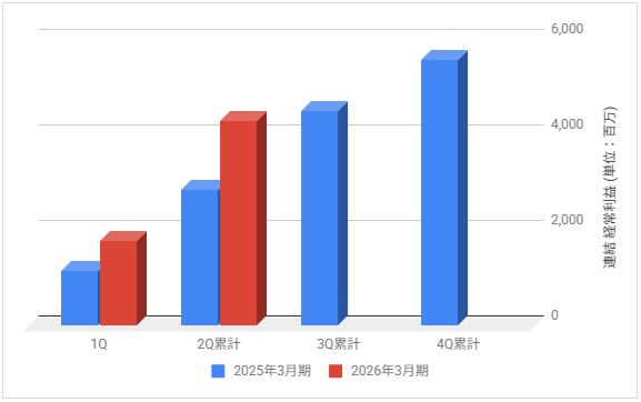 下記は2026年3月期の各決算期における連結経常利益の推移と前期との比較です。