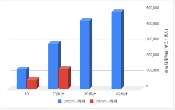 下記は2026年3月期の各決算期における連結経常利益の推移と前期との比較です。