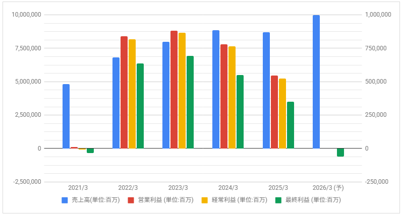 その後は減益で推移し2026年3月期は最終赤字見通しとしています。