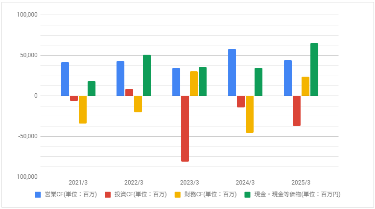 営業CFは比較的安定した推移です。2023年3月期の投資CFが大きいです。
