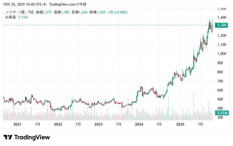 株価はレンジで推移していましたが、2023年末以降から上昇場面が出ており、2024年7月以降は大きく上昇推移に。